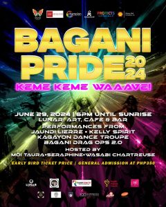 Tickets are NOW AVAILABLE for Bagani Pride 2024! Grab yours at the Bagani Community Center and Lunar: Art, Cafe, and Bar. Let’s make this celebration unforgettable!