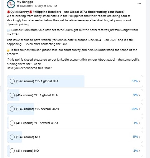 The survey unfortunately only ran for two days, so we did not achieve a significant enough pool of responders to determine if this was an issue that needed to be passed to the Philippine Department of Tourism or Department of Trade and Industry.