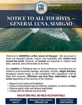 The Local Government Unit (LGU) of General Luna, Siargao, has issued strict warnings for tourists to adhere to local laws or face fines, legal action or even deportation.