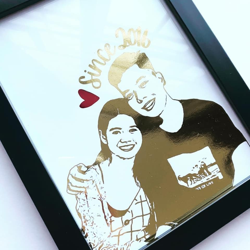 Coming from the hotel industry, she understands the importance of personalization. And how it makes people feel good to have things customized especially for them. Fiona started offering foiled portraits. And has since expanded her line to include cake toppers, mugs, vinyl’s and stickers, gift cards and tags, flower boxes, invitations and ornaments.